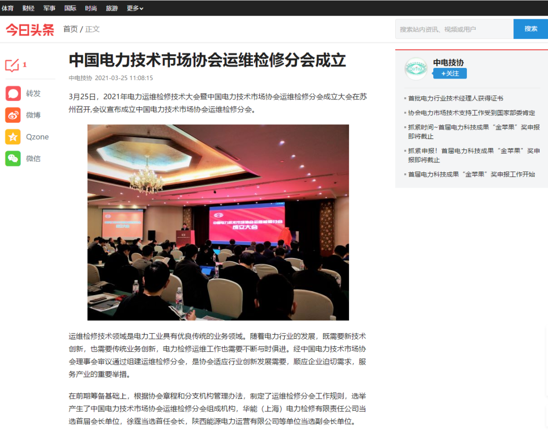 3月25日,2021年電力運維檢修技術大會暨中國電力技術市場協會運維檢修分會成立大會在蘇州召開,會議宣布成立中國電力技術市場協會運維檢修分會。