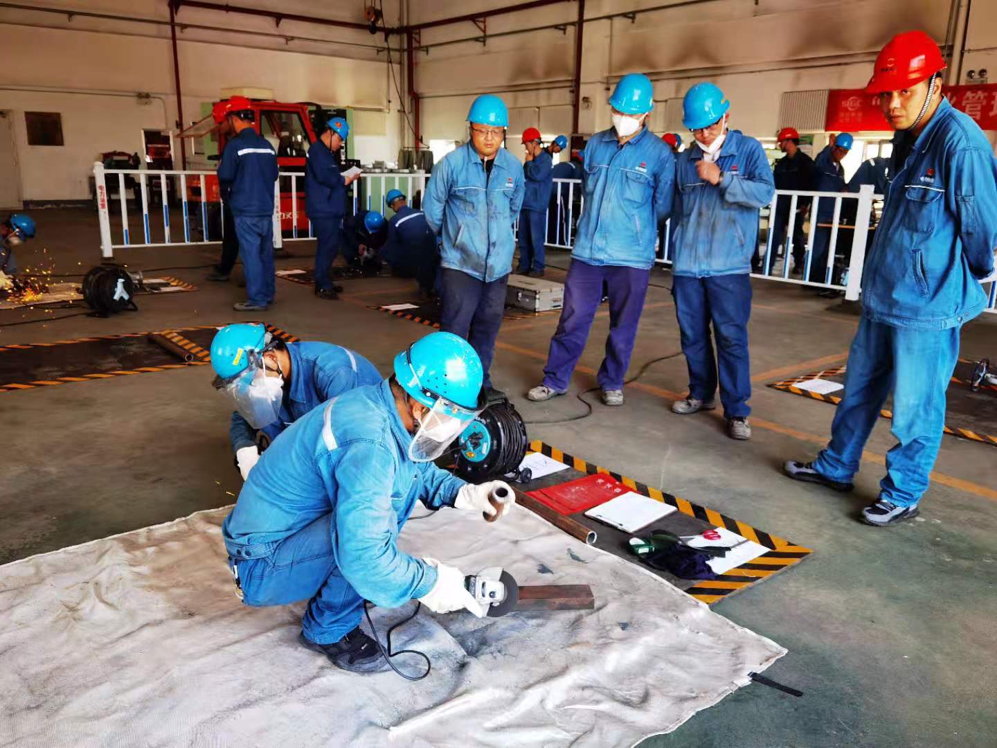 裁判員一聲“開始”,各小組迅速進入預定的比賽區域,兩人一組,配合默契。機務組參賽選手爭分奪秒地采用角磨機按預給尺寸進行坡口制作、管口打磨。轉子找中心過程中,隊員們沉穩從容,熟練地架表、測量、記錄,無論是實驗操作還是綜合計算,每個人都精益求精,奮勇爭先。儀電組參賽選手也不甘示弱,有條不絮地進行著電氣盤柜布線、電烙鐵焊接及電動機布線,每一步都態度認真、操作規范。經過激烈角逐,機務組氣化水班、儀電組電氣1班分別榮獲技能競賽第一名。