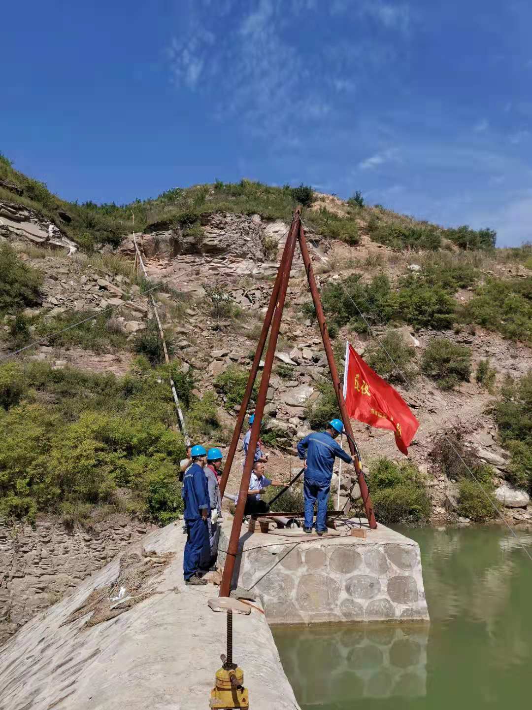 到了溝底,查設(shè)備,巡線路,找問題,隊(duì)員們馬不停蹄投入搶修工作。頭頂著火辣辣的太陽,眼前雖是一汪碧水,可溝里一絲風(fēng)也沒有,溫度超過40℃。人站在河壩上即使不干活,一會(huì)兒就汗流浹背,頭暈?zāi)垦!9ぷ髦校蠹也粫r(shí)抹一把臉上、身上的汗,開玩笑說:“魚在下面的河水里游泳,我們?cè)诎渡系暮顾镉斡尽!笨蔀榱舜蛲ㄟ@條關(guān)乎全村的“生命線”,大家臨深淵,沒有一個(gè)人臨陣退縮;涉險(xiǎn)灘,始終沒有一句怨言。