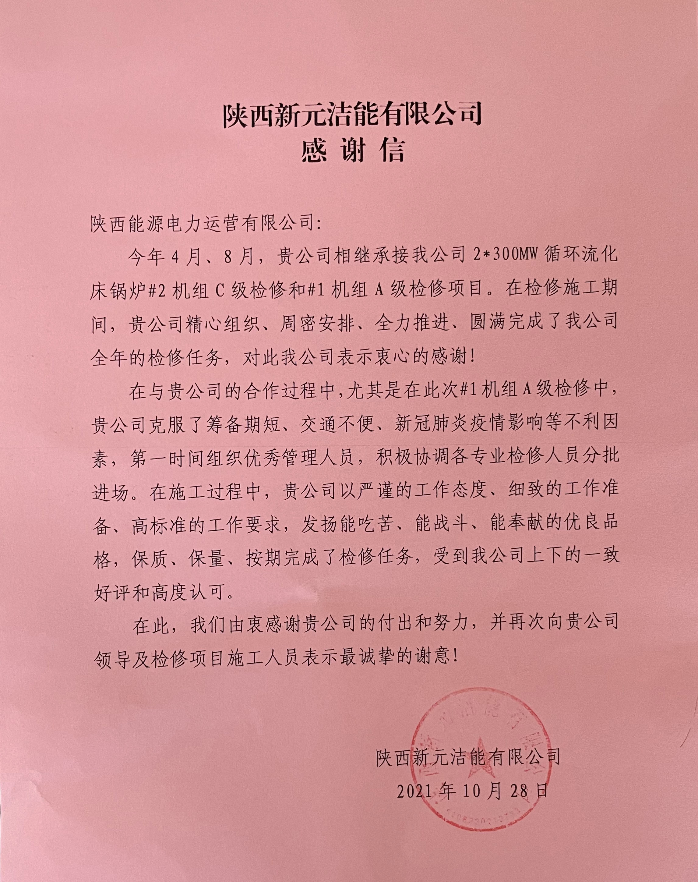 近日,公司收到陜煤集團(tuán)陜西新元潔能有限公司的感謝信,對(duì)在圓滿(mǎn)完成#2機(jī)組C級(jí)檢修和#1機(jī)組A級(jí)檢修項(xiàng)目中展現(xiàn)出的專(zhuān)業(yè)水準(zhǔn)和頑強(qiáng)作風(fēng)表示充分肯定,標(biāo)志著公司拓展集團(tuán)外等級(jí)檢修業(yè)務(wù)取得長(zhǎng)足進(jìn)展。