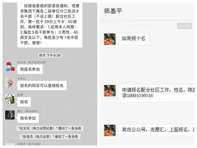 “我報名!”“算我一個!”“我在公眾號、志愿匯上面都報了名,一直沒有輪到我,現(xiàn)在我終于可以報名了!”“助力疫情防控是一份責(zé)任,我最近一直在小區(qū)當(dāng)志愿者。”沒有猶豫、沒有遲疑,不到10分鐘,陳基平、魏江、高西林、王昌輝,曹林、薛華智、趙佳杰、王澤朋、柯輝、楊博、鮑志華等十?dāng)?shù)名干部職工主動請纓,申請前往社區(qū)一線支援。