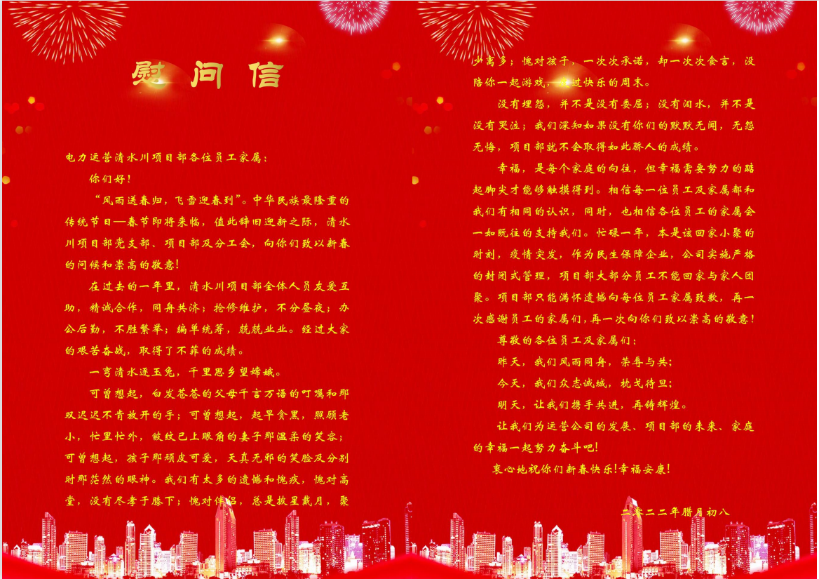 1月10日,一封慰問(wèn)信通過(guò)清水川項(xiàng)目部員工傳遞給遠(yuǎn)方的家屬,安靜的員工群瞬間被點(diǎn)燃了。