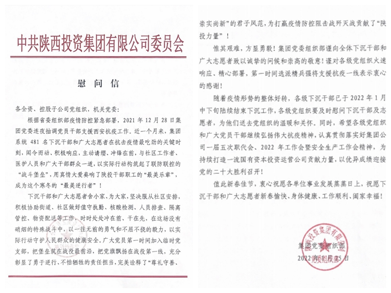 近日,公司收到了集團黨委組織部發來的慰問信,對集團系統下沉干部和志愿者在抗擊疫情最吃勁的關鍵時刻,聞令而動、沖鋒在前,與社區工作者、醫護人員和廣大干部群眾一道筑起聯防聯控“戰斗堡壘”的精神表示高度贊揚,對各級黨組織火速響應、精心部署,第一時間選派精兵強將支援抗疫一線表示感謝。