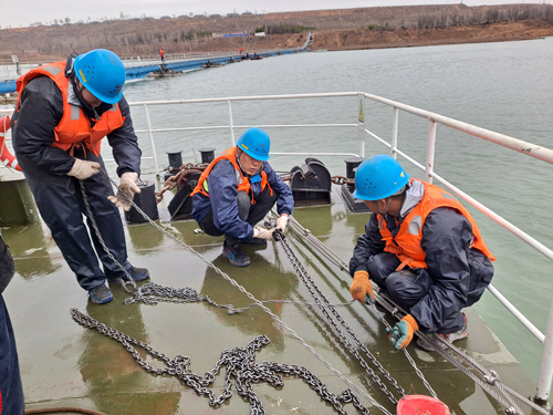在這樣惡劣的自然環境下,大家沒有一句怨言,只有一個信念,就是盡快將水源線恢復正常,保障業主方機組安全穩定運行。憑著運營人的沖勁和強烈的責任感,配合業主方順利完成3號浮箱起吊、取水管線調平的搶修任務,圓滿完成此次水源地泵船取水管線搶修工作。