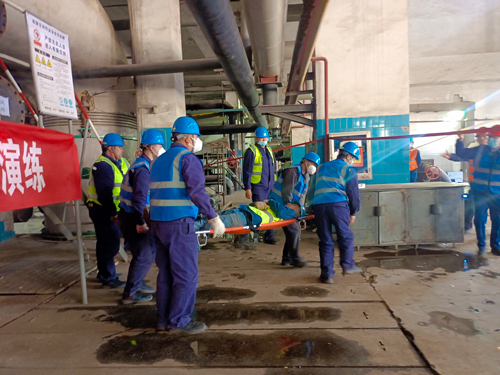 演練模擬一名員工在距離地面0.5米高的水平管道清掃#6機凝汽器內銅管口異物時,因管道濕滑導致腿部摔傷不能移動。事故發生后,現場人員立即組織自救,并及時向應急總指揮報告。根據事故現場情況,演練總指揮迅速集結應急救援小組成員,啟動有限空間應急預案。搶險救援組、傷員救護小組、安全保障小組迅速趕往現場,有序開展現場救援,待受傷人員脫離危險后,及時送往醫院進行治療。