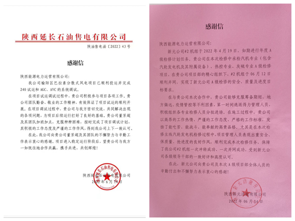 6月14日,陜煤新元潔能、延長售電先后發來感謝信,對公司優質完成#2機組A級檢修、巴拉素分散式風電機組240試運和 AGC、AVC 的系統調試項目表示感謝。