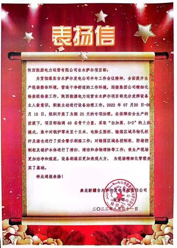 9月1日,公司相繼收到吉木薩爾發電檢修部、商洛發電設備部發來的表揚信,對吉木薩爾項目部高效優質完成為期25天的設備專項治理和商洛項目部鍋爐班加班加點完成搶修表示感謝。