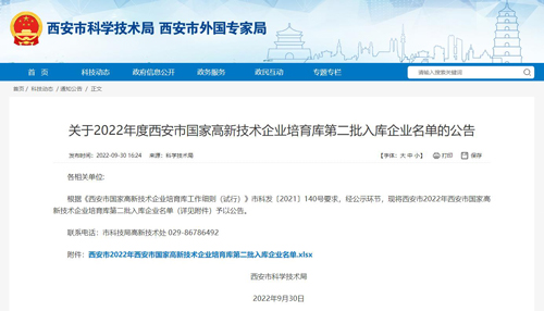 近日,西安市科學技術局發布了2022年度西安市國家高新技術企業培育庫第二批入庫企業名單,君創科技成功入選,入庫編號GQPY2022004751。