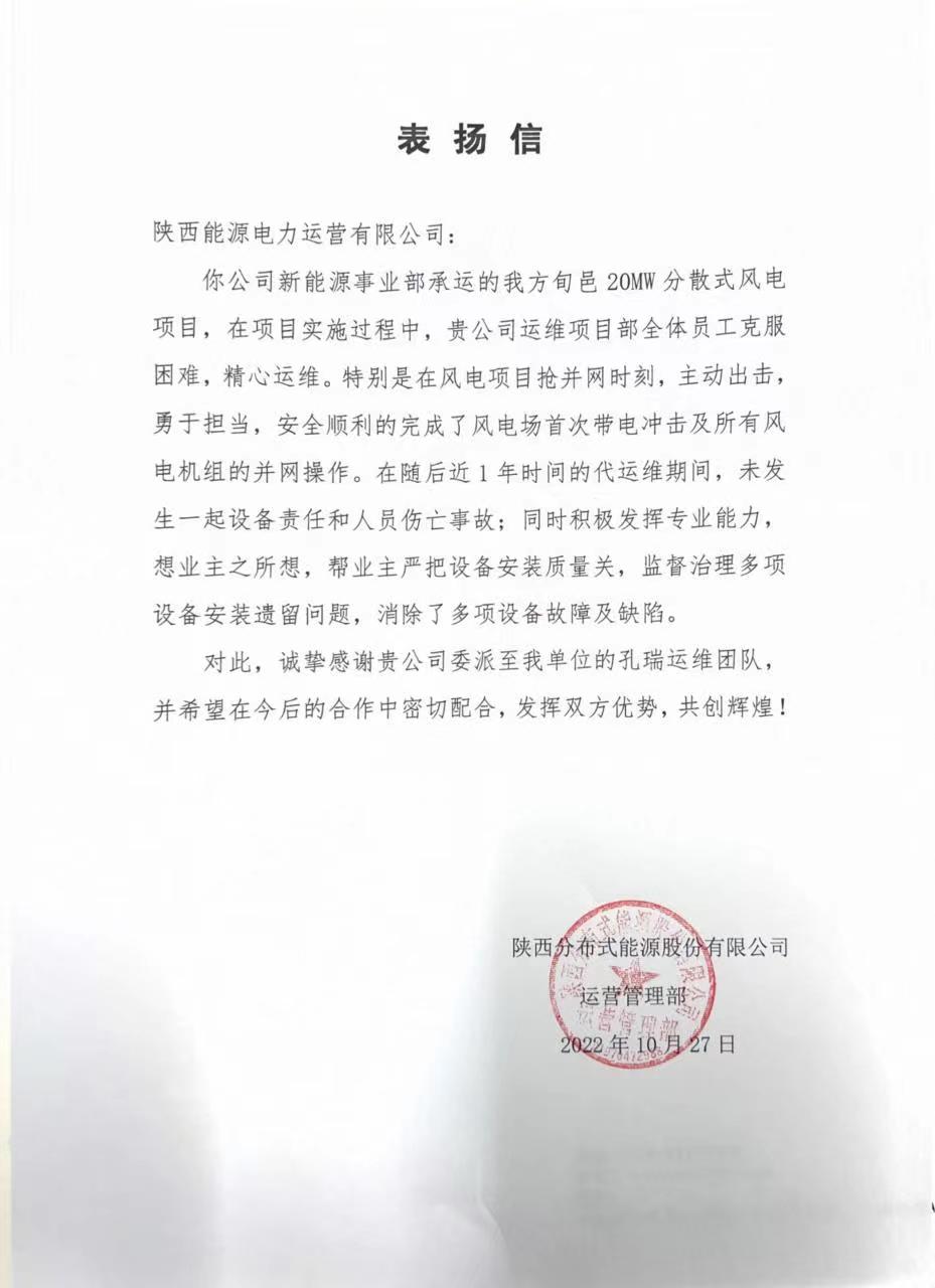 10月27日,公司收到陜西分布式能源公司發(fā)來的表揚信,對新能源事業(yè)部旬邑風(fēng)電項目部孔瑞運維團隊克服困難,精心運維,在急難險重工作中能主動出擊、勇于擔(dān)當(dāng)?shù)木癖硎靖叨荣潛P。