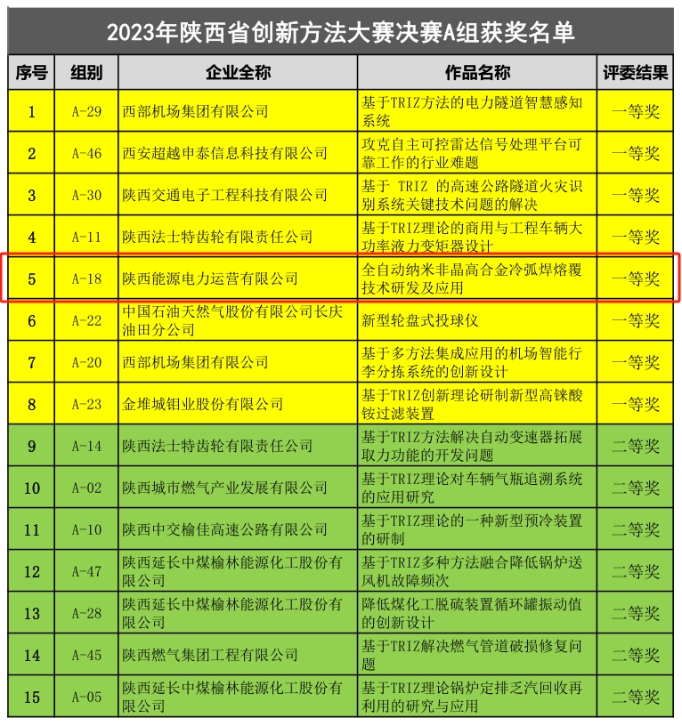 11月5日,公司“全自動納米非晶高合金冷弧焊熔敷技術研發及應用”創新成果在2023“秦創原·涇河新城杯”陜西省創新方法大賽中斬獲一等獎。這是繼2022年獲得陜西省創新方法大賽一等獎后,公司再次斬獲此項殊榮。