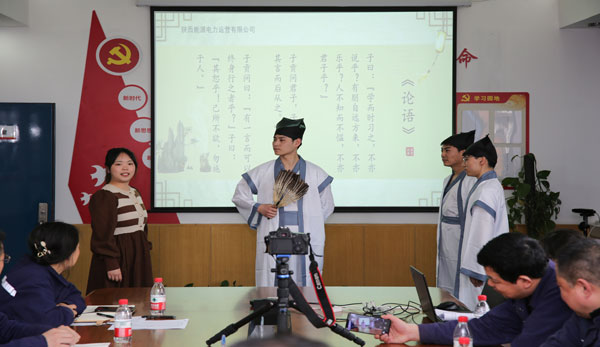 活動現場,與會人員回顧了自己工作以來的歷程,做了一次自我反省。在項目部自制MV引領下,參會人員齊唱歌曲《公民道德歌》,觀看道德模范事跡視頻,并通過青年員工自導自演的古今穿越情景劇演繹《論語》經典、講述“陜投好人”邢進故事等環節,引導干部職工提高思想道德、職業道德和家庭美德。