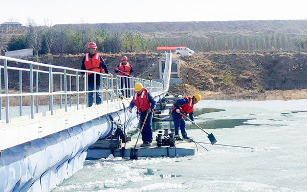 受氣溫回升影響,趙石畔煤電水源地王圪堵水庫冰面融化加速,大塊浮冰撞擊輸水管線浮箱,對取水泵船和輸水管線造成威脅。趙石畔項目部第一時間抽調人員組織清理疏通冰凌,經過9小時不懈努力,上游約2500平米的冰塊全部破碎,徹底疏通輸水管線,有效保證了取水泵船的安全。