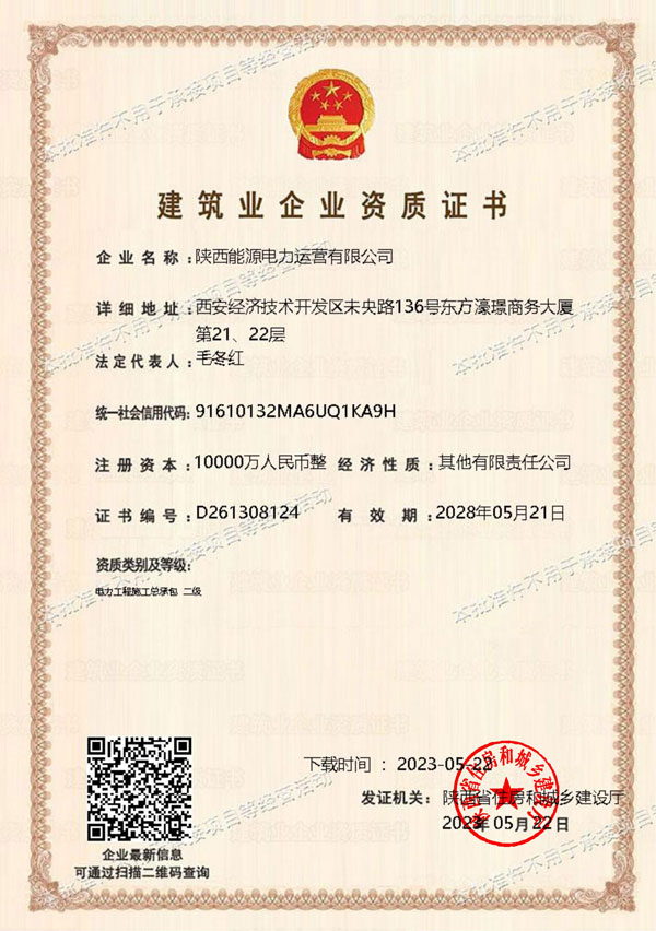 5月22日,經(jīng)陜西省住房和城鄉(xiāng)建設(shè)廳審批,公司順利取得電力工程施工總承包二級(jí)資質(zhì),為承攬單機(jī)容量20萬(wàn)千瓦以下發(fā)電工程、220千伏以下送電線路和相同電壓等級(jí)的變電站工程的施工業(yè)務(wù)贏得“入場(chǎng)券”,對(duì)公司“一體兩翼雙平臺(tái)”發(fā)展戰(zhàn)略布局具有重要意義。