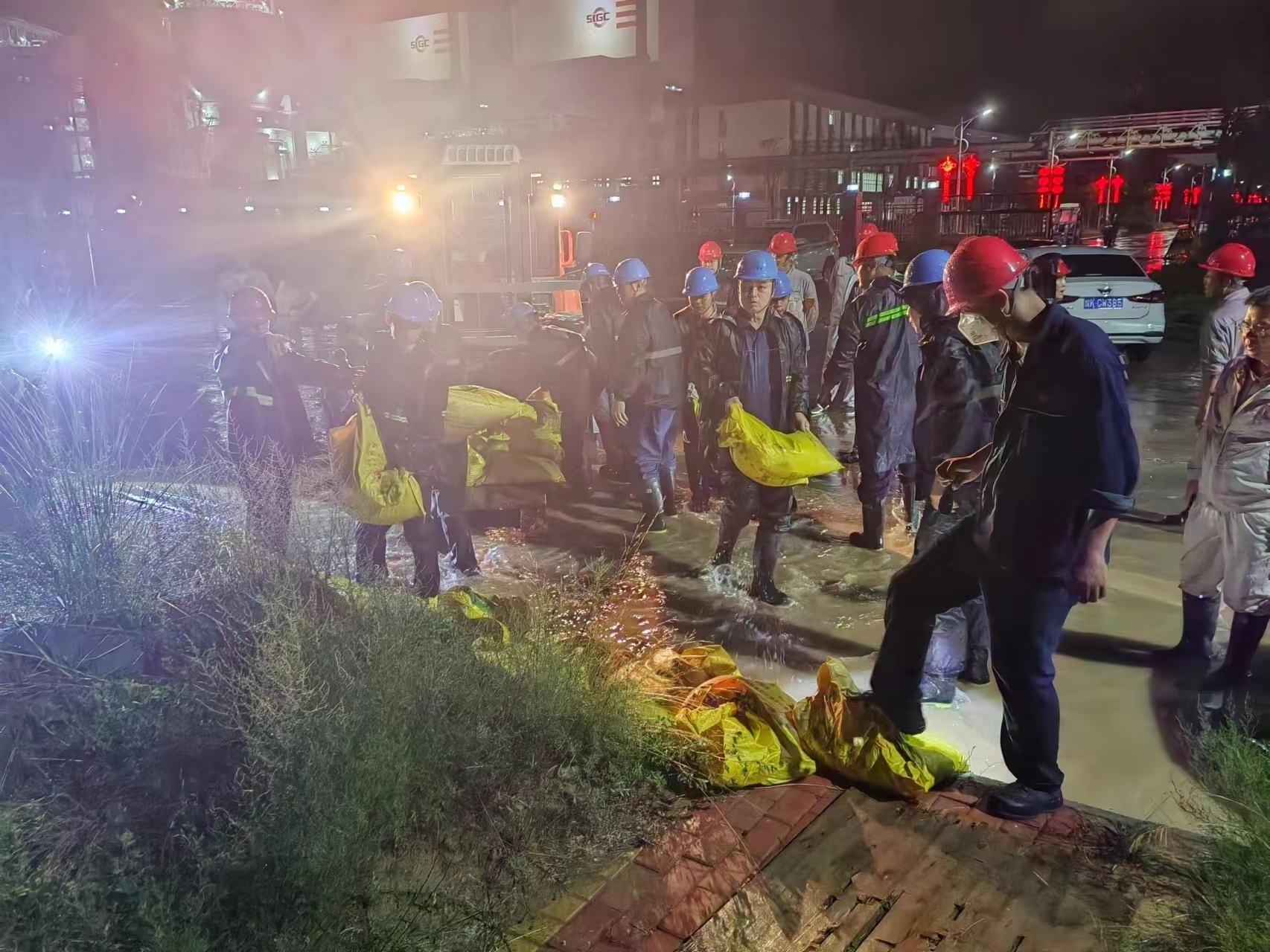 下午18時(shí)許,狂風(fēng)大作,天空下起小雨。值班和管理人員立即開始巡查。21:30,大雨滂沱,防汛應(yīng)急人員全員進(jìn)入現(xiàn)場搶險(xiǎn)。此時(shí),檢修樓前路面積水成河,雨水已沒過了腳面。由于雨量過大,全廠的雨水都匯聚到了西門外,排水渠的積水也越來越深,甚至有倒灌回廠區(qū)的情況發(fā)生。搶險(xiǎn)人員立即清理排水渠內(nèi)雜物,確保排水通暢。搬運(yùn)沙袋圍檔堵住西門通道,形成防洪堤壩,防止雨水倒灌。在項(xiàng)目部有序組織協(xié)調(diào)下,汛情快速得到控制。