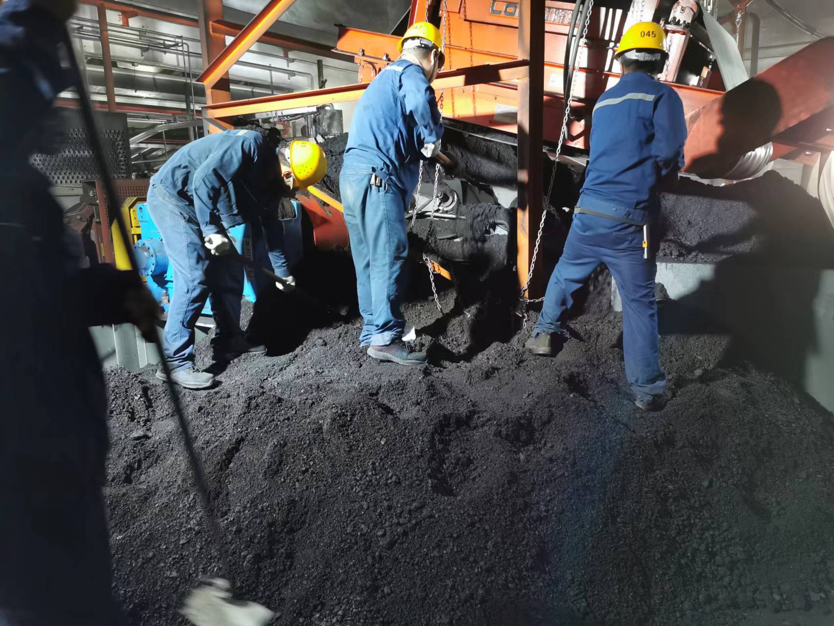 時間緊、任務急,在積煤最嚴重的#7帶拉緊小室,所有隊員面對堆積如小山的濕煤,齊心協力、配合默契,揮動著鍬鎬,爭分奪秒裝運積煤。有的積煤雖然沒那么濕,粘性卻很大,一鍬下去根本鏟不動,只能分割成“豆腐塊”逐一處理,最難對付的還是堆積在設備下部的積煤,大家直不起腰、發不上力,清理起來極為困難,只能用最原始的方式一鍬一鍬清理。30多度高溫使得運行車間內愈加悶熱,不一會兒人人大汗淋漓、手上磨起水泡,汗水浸透工衣,“煤山”也以肉眼可見的速度逐漸變小。經過40小時的連續奮戰,輸煤系統恢復正常運行。
