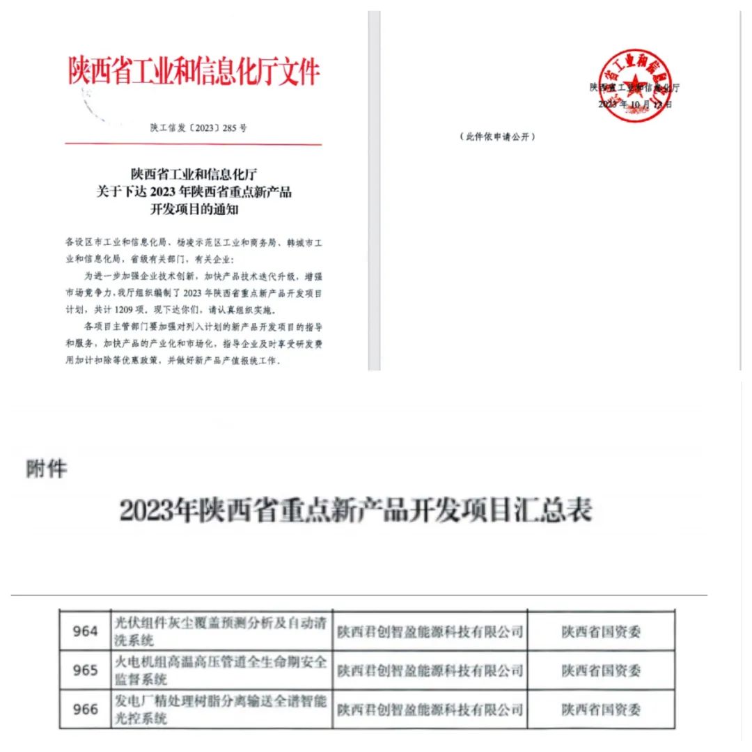 日前,陜西省工信廳發布了《關于下達2023年陜西省重點新產品開發項目的通知》,君創科技光伏組件灰塵覆蓋預測分析及自動清洗系統、火電機組高溫高壓管道全生命期安全監督系統和精處理樹脂分離輸送全譜智能光控系統等3個項目入選。