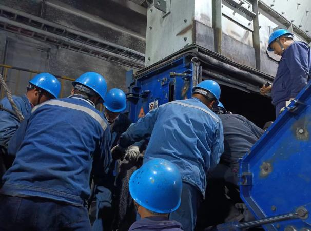 搶修方案確定后,兩組人員接續戰斗,展開搶修。在轟鳴的機器聲中,在粉塵彌漫的細碎煤機室內,大家搶時間、爭進度,經過42小時鏖戰,于12日凌晨5時許結束搶修,共完成20枚錘臂的拆除、回裝及9枚錘頭更換工作。
