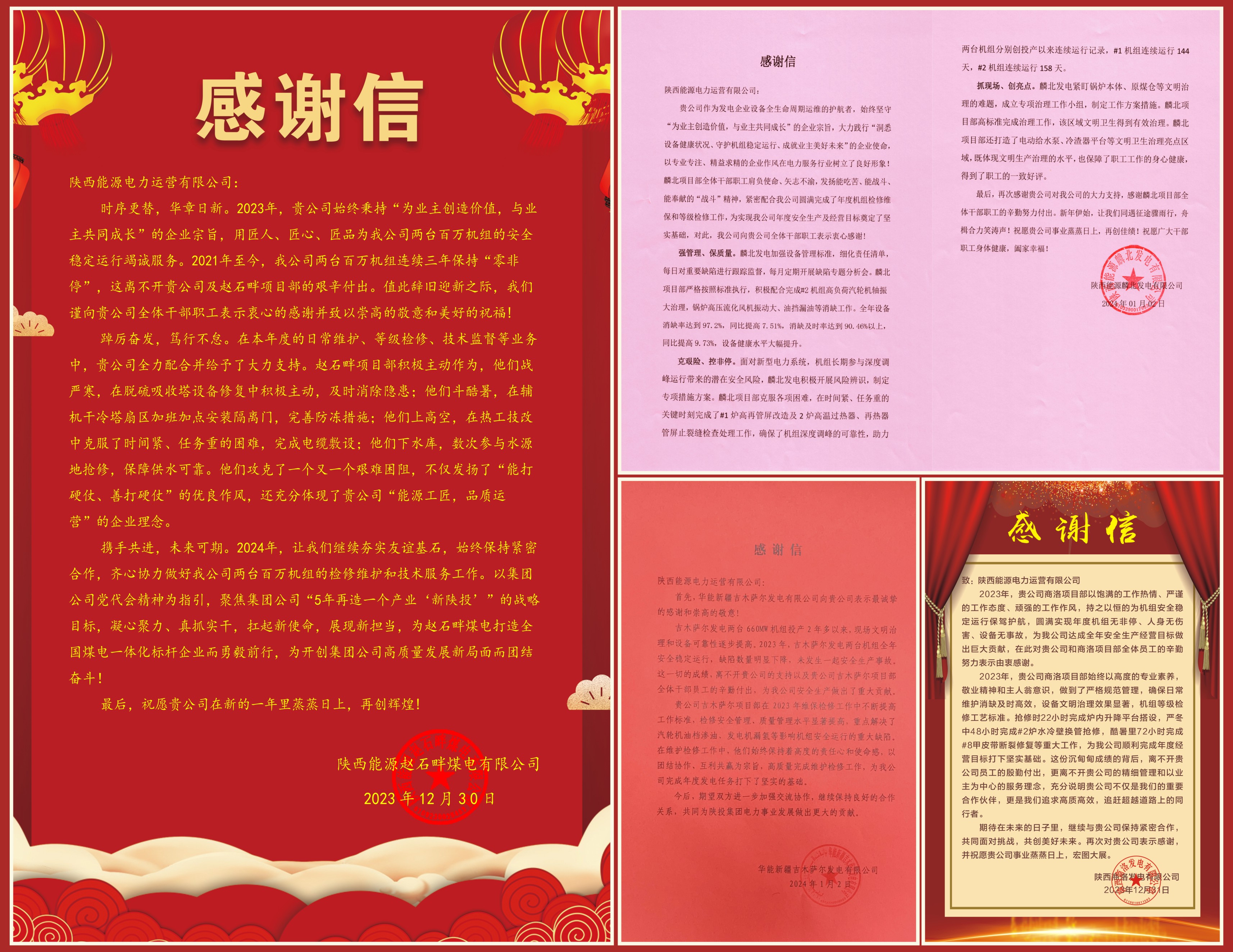 近日,公司連續收到商洛發電、麟北發電、趙石畔煤電、吉木薩爾發電等多家業主單位發來的感謝信,對電力運營各項目部在急難險重工作面前毫不退縮、沖鋒在前,圓滿完成機組運維檢修任務給予高度肯定和贊揚。