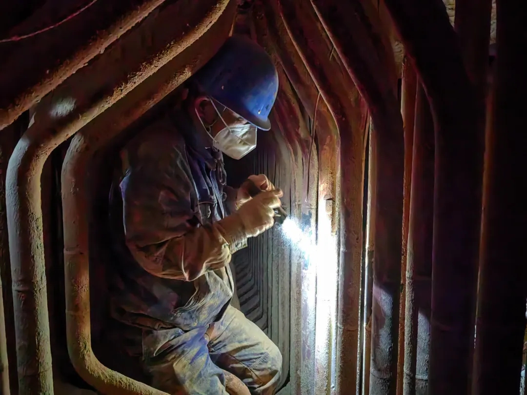 汽包壁溫和鍋爐大罩殼溫度元件是監視超溫、泄漏的重要設備,關乎機組安全穩定運行。由于溫度元件處在鍋爐大罩殼與機箱管排之間,周邊管排布置復雜、保溫材料多,武朝輝只能帶著同事鉆進狹小的空間內進行操作。“這地方又悶又熱,空間又小,一下子要更換106個‘鍋爐體溫計’,黨員不上誰上!”武朝輝擦著汗,樂呵呵地說道。