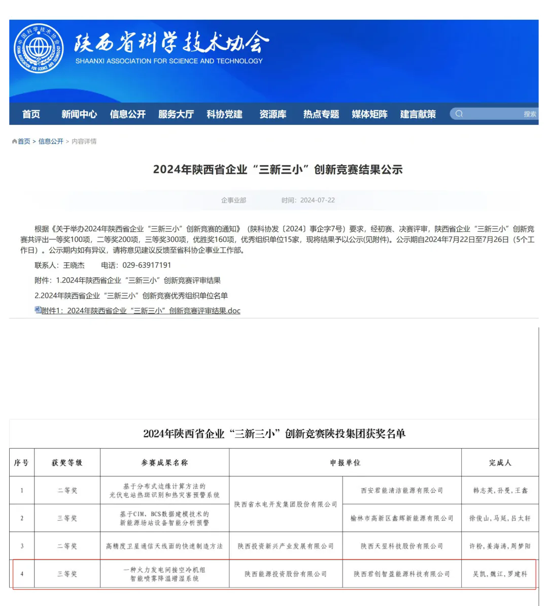 日前,君創科技 “一種火力發電間接空冷機組智能噴霧降溫增濕系統”榮獲2024年陜西省企業“三新三小”創新競賽三等獎。