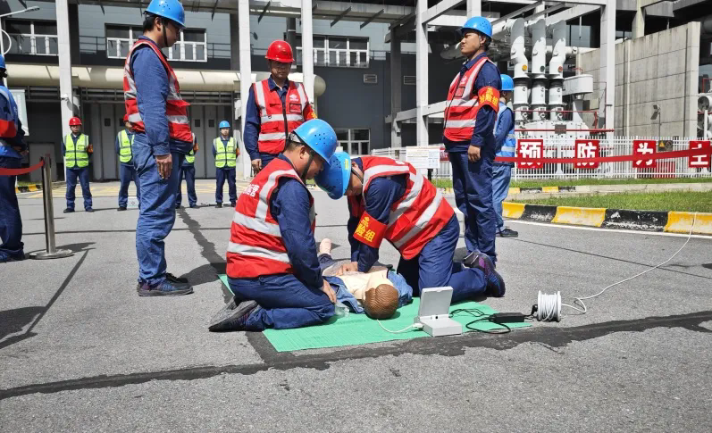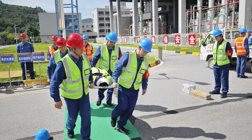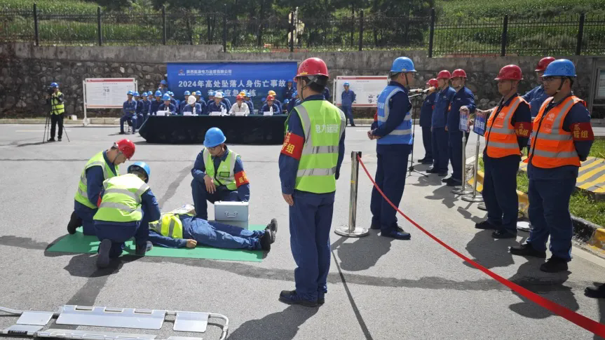 本次演練突出“實景、實員、實地、實戰”,結合電力檢維修作業中人身事故占比最高的高處墜落,實景模擬作業人員攀爬腳手架時發生墜落,導致人員骨折、外傷以及呼吸心跳停止等復雜情況進行應急救援。