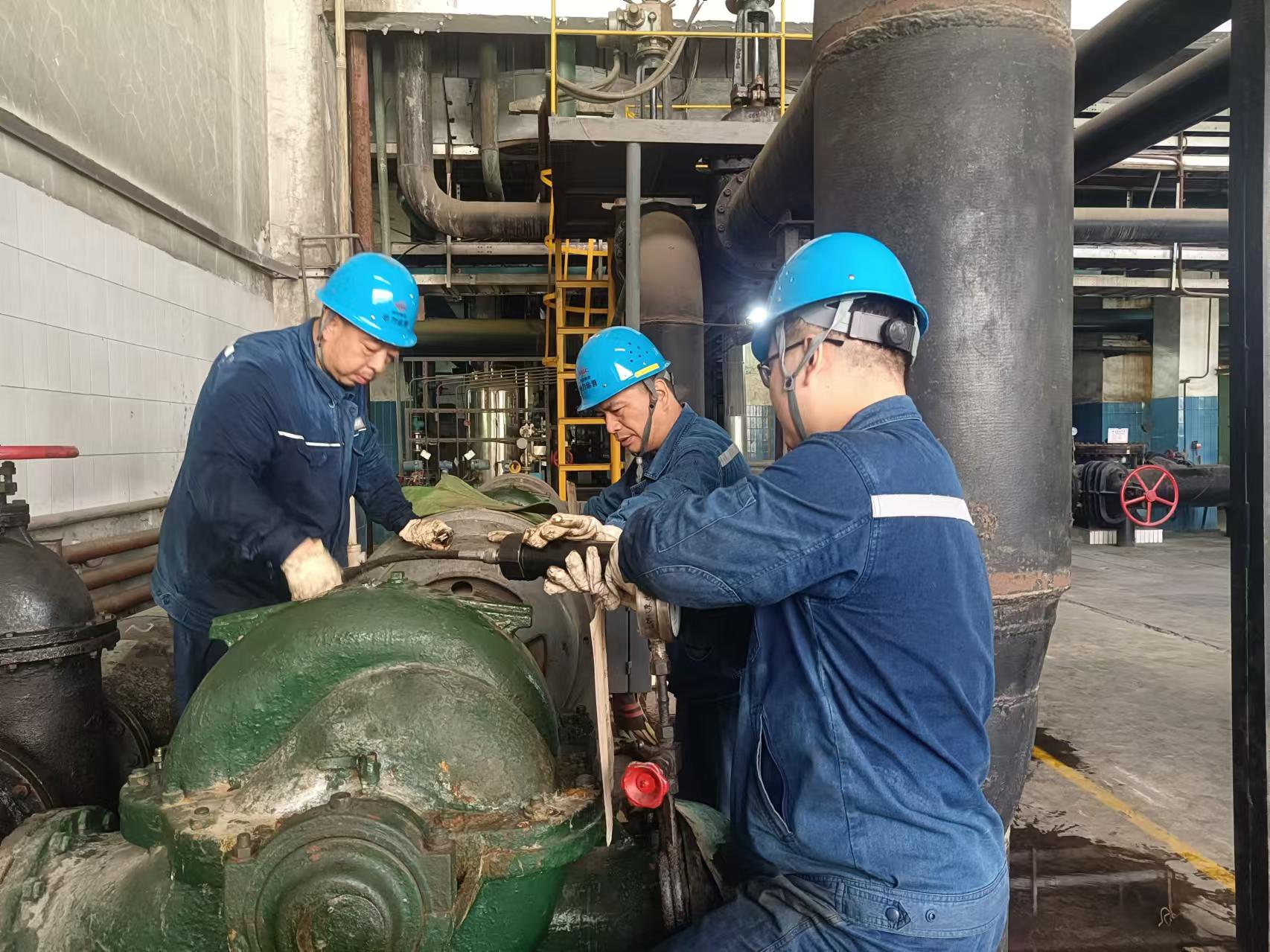 “大家都加把勁,這臺設備可關系到整個機組的穩定運行,必須盡快維修好!”主機班解江波說完便拿起專用工具熟練地拆卸零部件。甲凝結泵消缺作業現場,溫度高達40度,檢修人員氣定神閑地一遍遍盤動轉子,拿出“繡花”功夫,對凝結泵推力瓦塊逐個進行微調,來回近八個小時,工作服濕了干、干了濕,大家笑稱是蒸“桑拿浴”,但卻始終沒有停歇,一心只想早點讓設備運轉起來,直到推力瓦塊測點溫度正常,設備運行平穩,工作人員懸著的心才終于放下。