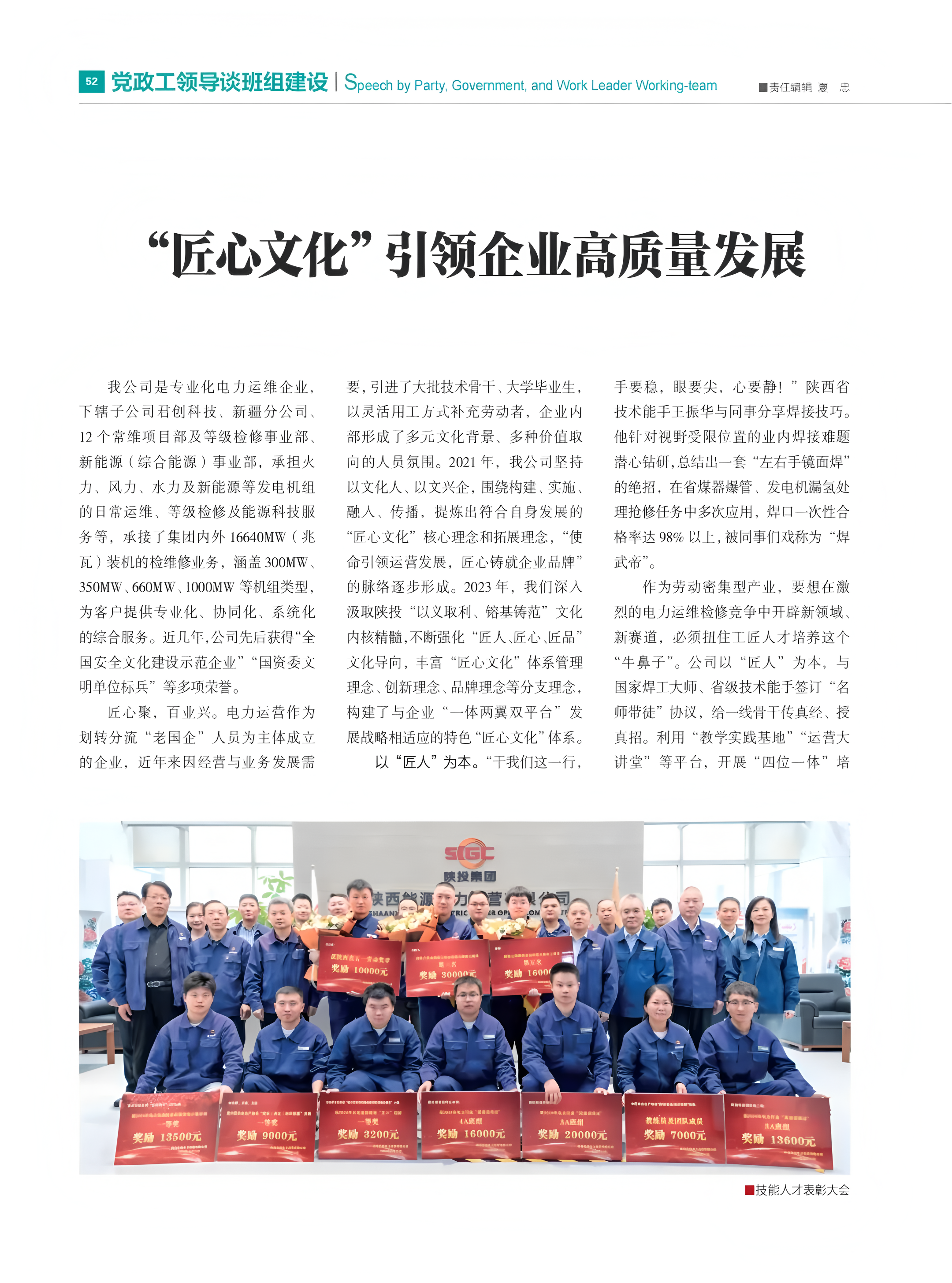 “匠心”不僅是對(duì)極致工藝的精細(xì)追求,更是對(duì)先進(jìn)科技的虛心學(xué)習(xí),公司樹立科創(chuàng)效治思維,以“匠心”為鏡,鑒機(jī)識(shí)變、觀瞻前沿,不斷深挖現(xiàn)場技術(shù)難題、熟悉行業(yè)前沿技術(shù)應(yīng)用,讓科技創(chuàng)新賦能檢修維保增“智”提質(zhì),多項(xiàng)創(chuàng)新成果斬獲全國火電運(yùn)維檢修“五小”創(chuàng)新成果一等獎(jiǎng)。電力運(yùn)營聚焦電力運(yùn)維、等級(jí)檢修、能源科技服務(wù)及新能源等領(lǐng)域開展課題研究,持續(xù)推進(jìn)技術(shù)研發(fā)和成果轉(zhuǎn)化工作,8個(gè)項(xiàng)目入選省重點(diǎn)新產(chǎn)品開發(fā)目錄,取得全國電力行業(yè)質(zhì)量管理小組一等獎(jiǎng) 2項(xiàng)、陜西省電力行業(yè)質(zhì)量管理小組活動(dòng)成果一等獎(jiǎng)4項(xiàng)、火電運(yùn)維檢修“五小”創(chuàng)新一等獎(jiǎng)7項(xiàng),科技成果不斷涌現(xiàn)。陸續(xù)開發(fā)上線“火電廠檢修運(yùn)維生產(chǎn)安全管理系統(tǒng)"“煤粉自動(dòng)均衡測控系統(tǒng)”等科技產(chǎn)品,實(shí)施“光伏數(shù)據(jù)分析智能診斷”應(yīng)用模塊,加快低代碼生產(chǎn)信息管理平臺(tái)建設(shè)進(jìn)度和成果應(yīng)用,將自主知識(shí)產(chǎn)權(quán)轉(zhuǎn)化為高新技術(shù)產(chǎn)品及服務(wù),讓更多“匠心”之造融入新型電力系統(tǒng)建設(shè)。