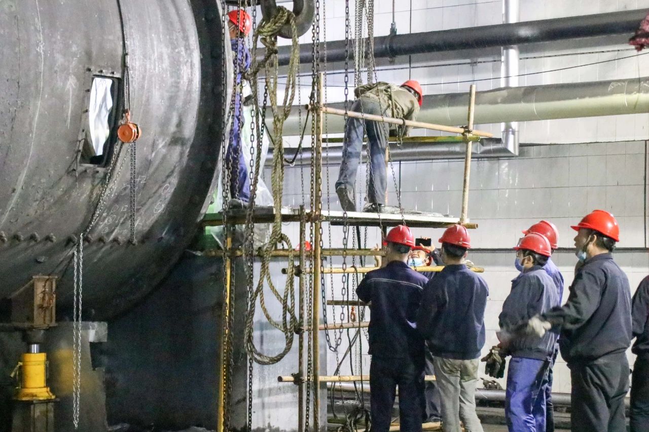 截止目前,經過全體人員7個晝夜的奮戰,鉗工、焊工、起重工多工種的緊密配合,磨煤機罐體已頂起,端蓋拆除工作正在緊張有序地進行。