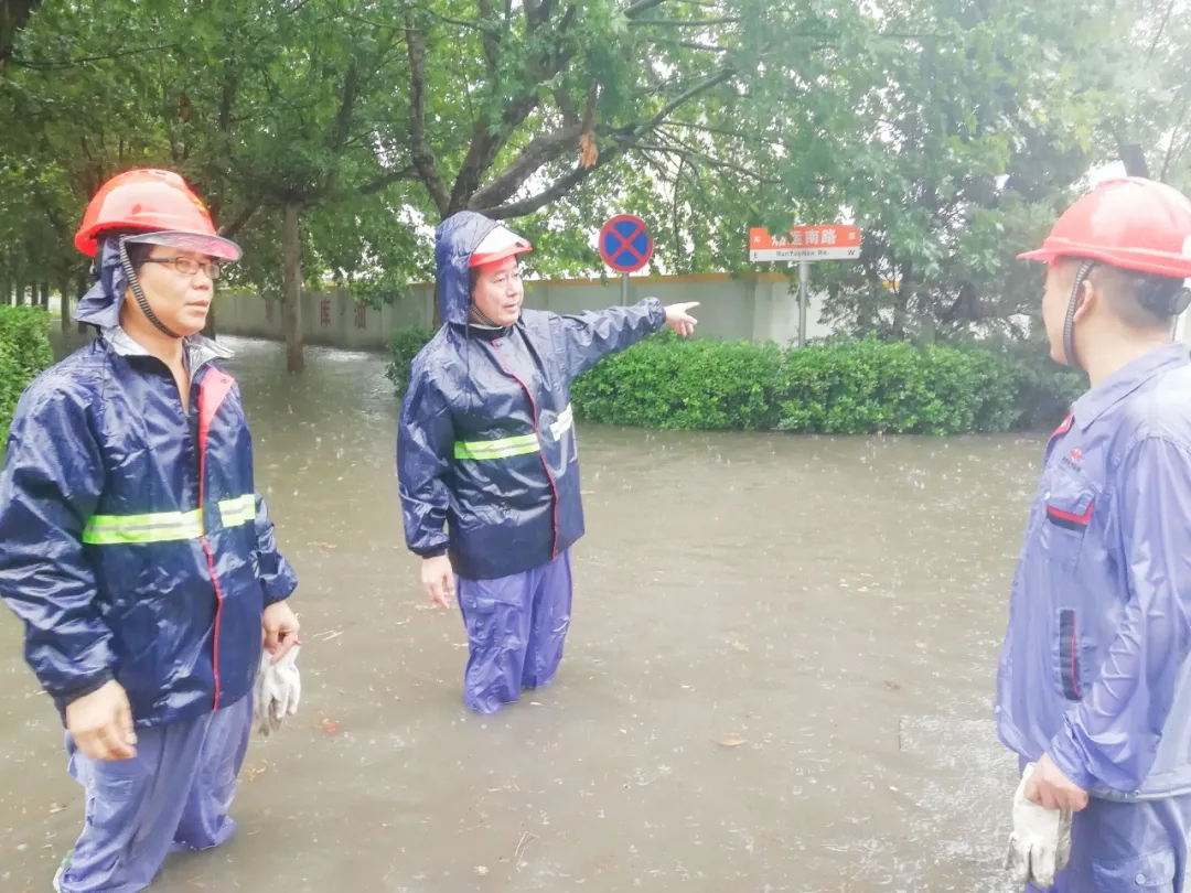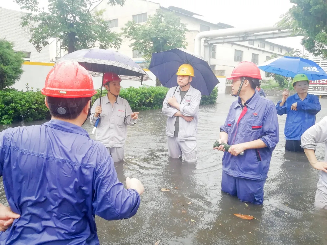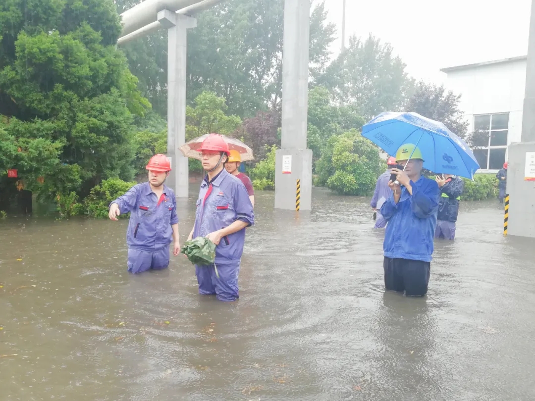 瓢潑大雨中,燃輸區域瞬間水深超過一米,項目部應急小組成員來不及換上雨衣雨鞋,就跳入齊腰深的積水中,排查險情,疏通水道。