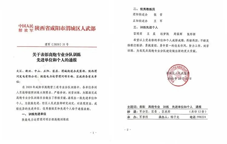 10月25日,在結訓總結表彰大會上,國防動員單位領導對渭河項目部參訓人員的表現給予充分肯定,對他們雷厲風行的作風和頑強拼搏的精神給予高度贊揚?!瓣兡茈娏\營渭河項目部高炮訓練班”被咸陽市渭城區人民武裝部評為“年度訓練先進單位”,張彤新同志被評為“年度訓練先進個人”,并予以通報表彰,為公司贏得了榮譽。