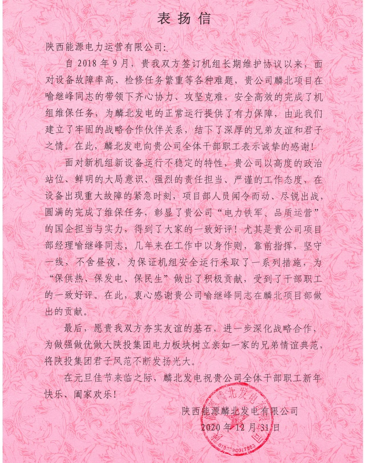 收到感謝信后,公司上下深受鼓舞,認(rèn)為這封表揚信既是業(yè)主方對公司既往工作的肯定,又是對項目部員工堅守一線默默奉獻的褒獎!在今后的工作中,公司將進一步加強與麟北發(fā)電的戰(zhàn)略合作,優(yōu)質(zhì)高效完成各項檢修維保任務(wù),為做強做優(yōu)做大集團電力板塊、樹立親如一家的兄弟情誼典范做出不懈努力。