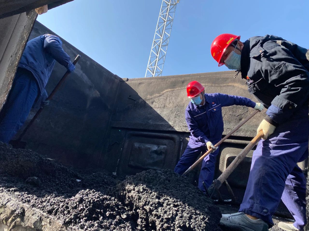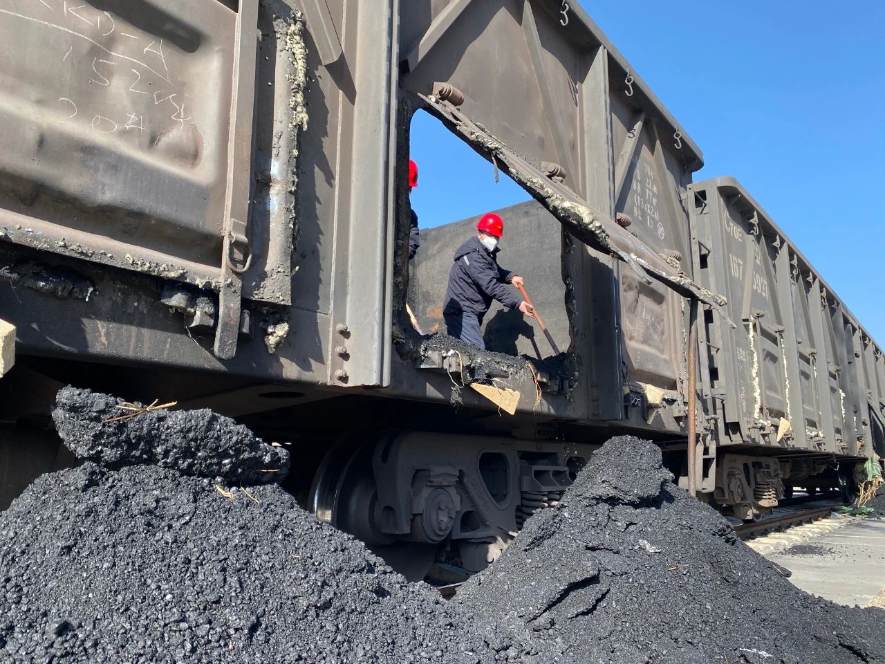 1月12日,商洛項目部從管理干部中緊急抽調(diào)18名人員奔赴煤場,對“凍煤”展開人工清理。清理凍煤是一項費勁的體力活,更是一項費時的細活。車廂內(nèi),工作人員有序分工,揮動鐵鎬和鐵鍬,清理著車廂底部、拐角等處的凍煤。厚厚的凍煤堅硬如鐵,工作人員掄圓胳膊,使勁揮動鎬頭卻只“啃”下很小的一塊。一鎬鎬挖,一塊塊敲,一點點清,清理完一節(jié)車廂,汗水早已濕透了棉服,卻沒有一個人停下手上的活,又馬不停蹄轉(zhuǎn)戰(zhàn)另一節(jié)車廂。
